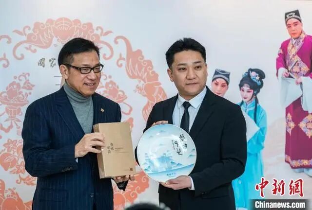 图为国家京剧院副院长、国家一级演员、中国戏剧梅花奖得主田磊(右)和香港西九戏曲中心顾问小组主席杨伟诚交换纪念品。中新网记者 侯宇 摄